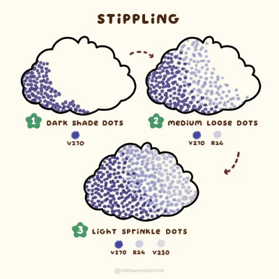 1. Start with the dark shade and dot closer together in the shadow area.